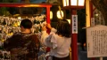 - 穿著浴衣的朋友們吃著傳統街頭小吃。